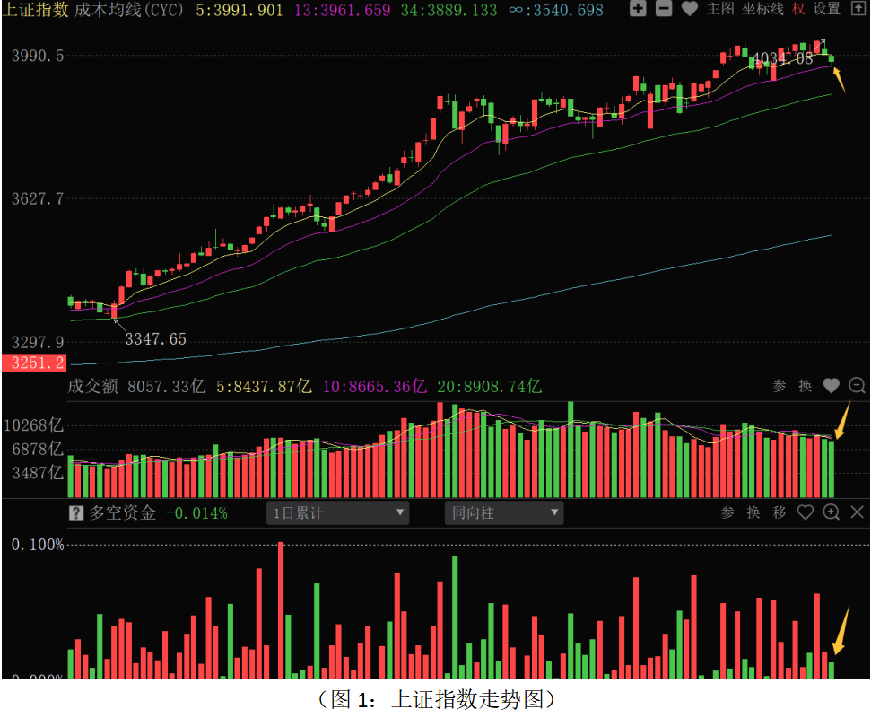 从上证指数走势来看:在中日关系紧张、地缘政治不稳的背景下,股指波动幅度有所加大,短线跌破5日成本均线,考验13日成本均线的技术支撑。成交量总体处于持续萎缩状态,多空资金小幅净流出不足5亿元,一方面可以看出4000点位置资金有一定的分歧,同时资金整体离场动作不强,并有小幅度逢低进场动作。8月底以来,行情一直沿着13日成本均线上行,该均线是指数震荡上行的重要支撑,当前股指距离13日成本均线较近,短线支撑力度有待观察,如果被有效跌破,市场短线震荡幅度会加大,不排除会考验8月底至10月底震荡平台上沿3900点一带的可能。从优化布林线指标来看,股指触及“中上轨”位置后回落,目前中轨位置被跌破,中轨位置是波段趋势的分水岭,也是多方的重要防守位置,短线不能快速收复,不排除股指会考验中下轨位置的支撑(3920点一带),所以技术上重要支撑位在3900-3920点一带。当前市场运行逻辑:外部环境上,中日关系紧张,地缘政治对资金整体做多积极性有一定的压制。内部因素上,前三季度GDP增速整体超预期,四季度超预期增量政策出台的急迫性降低,同时10月份公布的各项经济数据明显下滑。市场新政策预期的提升,需要等到12月份的中央政治局会议和中央经济工作会议对明年政策的新定调上。同时,近期管理层定调强化战略性力量储备和稳定市场机制建设,提升资本市场内在稳定性,坚决防止市场大起大落、急涨急跌。虽然近期超预期政策落地预期不高,但中期政策的稳定和延续性对市场中期走势起到稳定的作用。当前政策真空期阶段,市场向上修复的政策面和基本面逻辑减弱,市场总体会以横盘震荡走势为主。操作上应采取稳健应对策略,总仓位控制在六成左右,底仓持股为主,浮动仓位根据个股的资金流向和决策信号做好动态调整,紧盯大盘关键技术压力的资金流向做好低吸或高抛的操作。从0Z指数走势来看:股指围绕中、短期成本均线窄幅震荡小幅上涨,全市场下跌个股家数略多于上涨个股家数,说明个股没有随大盘指数出现普跌走势。多空资金净流入261.33亿元,对比上海市场的资金流向,主力资金对于中小市值方向有一定的操作积极性,说明资金开始小幅度回补前期调整的科技成长等方向,主力这一动向前一日早评已经有所提醒。从短期结构牛指标组来看:马股比例从71%左右逐步下降至60%以下,牛股比例明显抬升至28%左右,上行的速率有所趋缓;熊股比例总体处于低位徘徊状态,说明短期个股整体风险释放力度不强,市场个股机会主要在前期强势股之间高低切换和快速轮动。当前操作上应采取稳健策略应对,总仓位控制在六成左右,底仓持股为主,浮动仓位紧盯大盘关键技术压力的资金流向做好低吸或高抛的操作。
