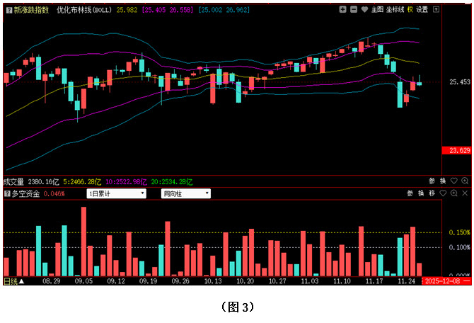 今日两市上涨个股共1692只,其中涨幅超过3%的个股338只,涨幅在9.9%以上的个股83只;下跌个股共3593只,其中跌幅超过3%的个股337只,跌幅在9.9%以上的个股12只。图3所示为指南针特有的0Z指数K线图,从图中可以看到,今日0Z指数冲高回落,小幅收阴,收盘位置依然处于优化布林下紫线附近。可见场内多数个股在经过前两日的连续回升后,今日都有所休整,0Z指数尚未回到优化布林中轨上方,市场整体走势依然偏弱。从下方的多空资金来看,今日多空资金为流入状态,但资金流入量较昨日明显减少,说明多方后续力量有衰减迹象。在这种情况下,如果空方趁机连续施压,刚刚回升起来的多方人气就会快速下降,从而导致行情出现再次回落。建议大家控制好仓位,保持谨慎。