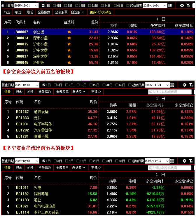 从板块资金动向数据来看,截止到今日午间收盘时,在资金流入榜上,通信设备板块以87.08亿的资金流入额位居榜首;其次是元件板块,资金流入40.11亿;此外,电子半导体板块、汽车零部件板块、贵重金属板块也都相继上榜,三个板块的资金流入额分别为22.17亿、21.70亿、19.93亿;再看资金流出榜,火电板块引领做空,资金流出3.32亿;其次是饲料养殖板块,资金流出0.92亿;此外,渔业板块、电气电源设备板块、专业工程及装饰板块的资金流出额也都相对较多,分列资金流出榜第三到第五名位置。综合比较后可知,今日上午不仅通信设备板块资金流入高达87亿,元件、电子半导体、汽车零部件等板块的资金流入额也都在20亿之上,场内热点依然较多,多方人气不断回升;反观空方阵营,只有火电板块资金流出高于3亿,其余板块的资金流出额均不足亿元,整体抛压很小。可见今日上午多方力量依然强于空方,资金继续以流入为主,大盘也在资金的推动下重新回到了3900点整数关口上方,投资者的做多信心得到进一步恢复。在这种情况下,随着市场下方基础逐步夯实,后市行情或有继续向上攀升的可能。建议大家可使用“指数叠加”功能及时找出近期走势强于大盘的热点板块,并在其中优选个股,择机介入。手机版如何使用“指数叠加”功能抓刚刚启动走强的轮动股?详细步骤点击立即学习。