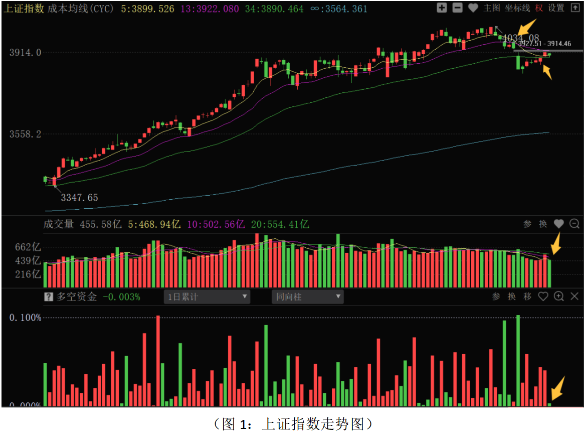 从上证指数走势来看:昨日股指连续上涨之后出现小幅回落走势,成交量再度萎缩,多空资金净流出69.83亿元,短期主力资金进场积极性有所降低。板块结构上,70个板块中45个板块下跌,其中近期反弹居前的金属非金属新材料、贵重金属、计算机应用、普通有色、传媒服务等板块跌幅居前,可以看出近期超跌反弹品种面临解套盘和近期抄底获利盘的抛压进入震荡走势中。3900点得而复失,虽然跌破5日成本均线,但34日成本均线有一定的支撑。市场短期的调整,一方面是连续反弹修复后,股指临近前期平台位置的技术压力;另一方面近期市场成交量总体萎缩,资金整体进场持续性不高制约股指的反弹空间。当前股指仍在11月21日跳空阴线实体中运行,空方仍占据一定的主动权。股指连续反弹至11月21日跳空缺口位置,资金补回缺口的动力不足。近期市场做多积极性能否进一步提升,还需政策面的进一步指引,密切关注即将召开的中央政治局会议、中央经济工作会议的政策定调,以及美联储的议息情况。如果国内政策定调积极,美联储降息落地,国内外政策共振对资金做多积极性会起到积极作用,股指有望企稳继续修复。相反,如果国内政策没有超预期定调,股指短期仍有回探整固的需求。不过,稳经济政策中期有一定的稳定性和持续性,政策的发力会根据国内外因素的变化有针对性地落地,虽然短期资金进场积极性不高影响反弹节奏,但总体走势以稳定走势为主。从优化布林线指标来看,股指自跌破下轨出现技术超卖走势后连续修复,目前已经站上“中下轨”位置,临近波段趋势分水岭的中轨位置,中轨位置的压力较为明显,目前仍是相对弱势的震荡和探底阶段,短线关注“中下轨”位置的支撑和资金流向,不排除短线会回抽确认和考验3870-3880点的支撑力度。从0Z指数走势来看:股指连续上涨之后小幅震荡下跌,全市场下跌个股家数和上涨个股家数比超2:1,个股连续反弹后进入震荡调整阶段。多空资金净流出81.33亿元,对比前几日的多空资金流向来看,主力资金流入力度有所减弱,但没有出现大幅度净流出,属于超跌反弹后的正常震荡走势。目前5日和无穷成本均线位置有一定的技术支撑,由于技术上股指临近前期平台和筹码密集峰位置,叠加政策等待期,个股分化和指数短期震荡走势会有所延续。从短期结构牛指标组来看:熊股比例经过前期做空动能连续释放之后,明显拐头向下至21%左右;马股数量明显抬升至66%左右;牛股比例处于低位缓慢抬升至12%左右,市场机会主要在超跌品种的反弹修复上,近期超跌反弹品种的震荡尚未出现大幅的调整,但是个股从反弹进入反转行情的牛股机会增加不明显。当前操作上应采取稳健的策略应对,总仓位继续控制在5成左右,底仓持股为主,短线超跌反弹品种应根据个股关键资金流向和决策信号做好仓位的动态调整,剩余资金紧盯超跌信号和主力资金流向做好低吸操作。