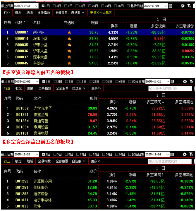 从板块资金动向数据来看,截止到今日收盘时,在资金流入榜上,光学光电子板块以60.72亿的资金流入额位居榜首;其次是贵重金属板块,资金流入31.88亿;此外,普通有色板块、专用设备板块、家用电器板块的资金流入额也都相对较多,分列资金流入榜第三到第五名位置;再看资金流出榜,计算机应用板块引领做空,资金流出90.83亿;其次是传媒服务板块,资金流出43.34亿;此外,通信设备板块、电子半导体板块、元件板块也都相继上榜,三个板块的资金流出额分别为21.51亿、21.41亿、20.44亿。综合比较后可知,今日不仅计算机应用板块持续大幅做空,资金流出高达90亿,而且在其带动下,传媒服务、通信设备、电子半导体、元件等板块的资金流出额也都超过了20亿,科技类板块的集体施压令场内恐慌情绪有所加剧,整体抛压明显增大;不过多方也没有放弃,除光学光电子板块资金流入超过60亿之外,贵重金属、普通有色、专用设备、家用电器等板块也在积极做多,在一定程度上对行情起到了稳定作用。从六大战区的情况分别来看,截止到今日收盘时,只有深市小盘战区为资金流入状态,资金流入额6.52亿;其余五个战区则均为资金流出,其中不仅深中大盘战区资金流出超过55亿,创业板战区的资金流出额更是高达80亿。可见今日整体上空方力量明显强于多方,资金以流出为主,说明面对3900点上方的压力,多方表现得仍较为犹豫,故此市场迟迟无法向上强力拉升,形成快速突破。在这种情况下,不排除行情有再次下探的可能。建议大家控制好仓位,谨慎操作。
