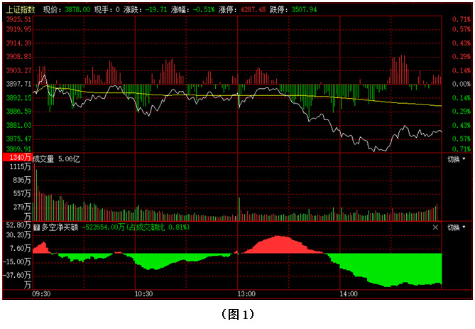 如图1所示,今日早间开盘后,大盘试图向3900点上方发起冲击,可惜持续性不强,指数很快就遇阻回落,虽然市场并未大幅下挫,而是围绕着3890点展开窄幅震荡整理,但多方却迟迟无法再次组织起上攻,以致投资者的做多人气逐步降低,下午一点半后,大盘出现进一步下探,盘中一度跌至3870点下方,好在尾盘略有回升,指数最终以3878点收盘。从下方的多空资金来看,早间开盘后,多方率先占据优势,但资金进场力度明显偏弱,盘中空方更是频频施压,以致在大多数时间内,资金均为翻绿状态,且最终也是空方占据了优势。可见今日空方力量依然强于多方,由于受到连续打压,市场出现进一步回落。好在大盘下跌幅度并不是很大,指数仍处于3900点附近。在这种情况下,只要多方及时发力反击,大盘就有快速回升到3900点整数关口上方的可能。所以建议大家不必过于悲观,可在控制好仓位的同时,使用“指数叠加”功能找出近期走势强于大盘的轮动热点板块,并在其中优选个股,逢低吸纳。手机版如何使用“指数叠加”功能抓刚刚启动走强的轮动股?详细步骤点击立即学习。