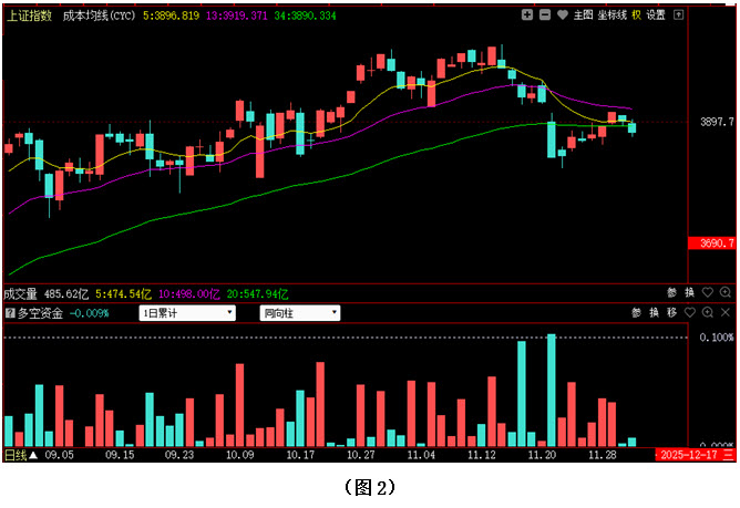 再看图2,今日大盘上攻时明显受到5日成本均线压制,指数无法向上形成突破,只得再次向下回探,导致34日成本均线失守,市场短期走势重新转弱。从下方的多空资金来看,今日多空资金为流出状态,且资金流出量较昨日略有放大,说明空方不仅在连续施压,而且随之恐慌情绪的蔓延,有更多持股的投资者加入到了空方行列。好在如果与前几日资金连续流入的总量相比,目前的抛压还是在可控范围之内,行情突然出现连续大幅杀跌的可能性较小。不过需要注意的是,大盘上方已再次面临多条重要成本均线的联合压制,如果多方依然犹豫不决,后市很可能会出现继续下探的动作。建议大家控制好仓位,提高警惕。