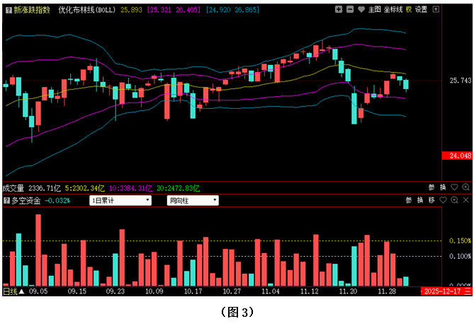 今日两市上涨个股共1443只,其中涨幅超过3%的个股249只,涨幅在9.9%以上的个股60只;下跌个股共3876只,其中跌幅超过3%的个股587只,跌幅在9.9%以上的个股18只。图3所示为指南针特有的0Z指数K线图,从图中可以看到,今日0Z指数继续收出阴线,且阴线实体有所加大。可见今日场内多数个股都出现了连续回落,市场整体走势依然偏弱。从下方的多空资金来看,今日多空资金为流出状态,好在资金流出量不大,所以多方目前仍有反击机会。但如果接下来多方无法及时反击,空方持续施压,导致0Z指数再次跌破优化布林下紫线,后市行情就很可能会出现进一步回落。建议大家控制好仓位,同时密切关注多空资金的进出情况以及优化布林下紫线对0Z指数的支撑情况,以便及时掌握行情变化,并做出相应决策。