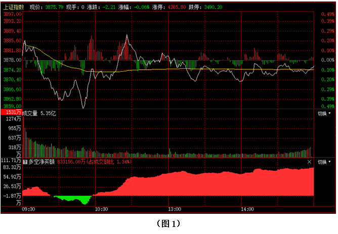 如图1所示,今日早间开盘后不久,大盘出现一波下探,指数盘中一度跌至3860点下方,好在市场并未持续杀跌,而是在3860点获得支撑,并快速反弹,可惜多方的反击未能持续,11点后大盘逐步回落到3870点附近,并在3870点至3876点之间展开窄幅震荡整理,指数最终以3875点收盘。从下方的多空资金来看,早间开盘后,多方率先占据优势,虽然盘中随着大盘下探,资金一度翻绿,但当市场出现反弹后,资金很快就重新翻红,并不断流入。可见今日虽然大盘仍在小幅下跌,但市场并没有出现大量恐慌性抛盘,反而有场外资金在趁机逢低进场。在这种情况下,行情向下的空间就会被多方逐步封杀,接下来只要资金持续回流,大盘就有望重新在资金的推动下重拾升势。建议大家面对市场的短期回探,不必过于慌张,可在控制好仓位的同时,使用“指数叠加”功能找出近期走势强于大盘的轮动热点板块,并在其中优选个股,逢低吸纳。手机版如何使用“指数叠加”功能抓刚刚启动走强的轮动股?详细步骤点击立即学习。