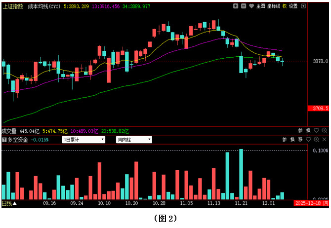 再看图2,今日大盘虽没有大幅下挫,但也没有出现明显回升,指数依然受到5日成本均线与34日成本均线的双重压制,在经过一天的震荡后,最终收出一颗阴十字星,可见目前市场短期走势依然偏弱,如果接下来多方仍迟迟无法向上形成突破,后市行情很可能会有继续下探的动作。从下方的多空资金来看,今日多空资金为流出状态,且资金流出量较昨日略有放大,说明空方不仅仍在连续施压,且有更多持股的投资者加入到了空方行列。好在与上周相比,目前的抛压还是在可控范围之内,行情突然出现连续大幅杀跌的可能性较小。故此在当前位置,投资者虽需要提高警惕,但暂时还不必过于恐慌。