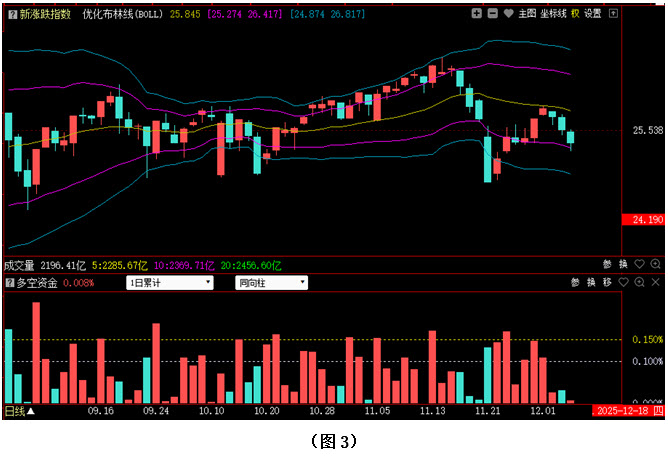 今日两市上涨个股共1455只,其中涨幅超过3%的个股260只,涨幅在9.9%以上的个股45只;下跌个股共3878只,其中跌幅超过3%的个股594只,跌幅在9.9%以上的个股19只。图3所示为指南针特有的0Z指数K线图,从图中可以看到,今日0Z指数继续收出阴线,且收盘位置已回落至优化布林下紫线附近。可见今日场内多数个股都出现了连续回落,市场整体走势依然偏弱。从下方的多空资金来看,今日多空资金为流入状态,但资金流入量很小,未能超过昨日的资金流出量,所以短期抛压尚未完全化解,行情难以大幅拉升。在这种情况下,如果接下来多方无法及时反击,空方再度施压,0Z指数就有可能跌破优化布林下紫线,令行情短期走势进一步转弱。建议大家控制好仓位,同时密切关注多空资金的进出情况以及优化布林下紫线对0Z指数的支撑情况,以便及时掌握行情变化,并做出相应决策。