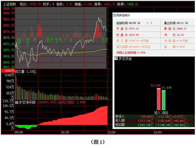 今日早间开盘后,大盘先是出现下探动作,但市场很快就在3860点附近获得支撑,并逐步向上回升,至中午收盘时,指数位于3878点。从日K线图上看,今天上午大盘走势与昨日十分相似,指数虽有向上反弹动作,但依然明显受到5日成本均线与34日成本均线的双重压制,市场短期走势仍旧偏弱,如果多方迟迟无法向上形成突破,不排除后市行情会有继续下探的可能。从下方的多空资金来看,早间开盘后,空方率先占据优势,但随着市场逐步回升,资金也由绿翻红,并持续流入。截止到中午收盘时,沪市当中多方力量高于空方超过5个百分点,资金流入130多亿。从六大战区的情况分别来看,截止到今日中午收盘时,六个战区均为资金流入状态,其中不仅沪中大盘战区与深中大盘战区资金流入双双超过80亿,创业板战区的资金流入额更是高达124亿。可见今日上午多方全面发力,各战区均有资金积极回流,说明目前多数投资者依然具备较高的做多热情。在这种情况下,只要行情企稳,场外资金就会快速回流,从而推动大盘重新回升到3900点上方。建议大家在控制好仓位的同时,可关注近期有资金连续流入且短期趋势保持向上的个股,逢低逐步吸纳。