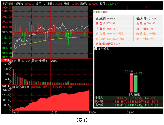 今日早间大盘虽大幅低开,但市场很快就出现反弹,不仅将早间的向下跳空缺口完全回补,而且还频频向3900点整数关口发起冲击,至中午收盘时,指数位于3899点。从日K线图上看,今天上午大盘低开后并未继续下探,指数很快回升至昨日收盘点位上方,可惜距离上方的5日成本均线仍有一段距离,市场短期弱势格局依然没有得到根本性改变。从下方的多空资金来看,早间开盘后,多方就占据优势,随后资金持续流入。截止到中午收盘时,沪市当中多方力量高于空方超过5个百分点,资金流入160多亿。从六大战区的情况分别来看,截止到今日中午收盘时,六个战区均为资金流入状态,其中不仅创业板战区资金流入超过140亿,深中大盘战区的资金流入额更是高达209亿。可见今日上午多方再次全面发力,各战区均有资金积极进场加仓,从而在很大程度上化解了昨日抛压,有利于行情逐步企稳回升。建议大家可在控制好仓位的同时,关注在3900点下方有资金积极加仓的个股,并逢低逐步吸纳。