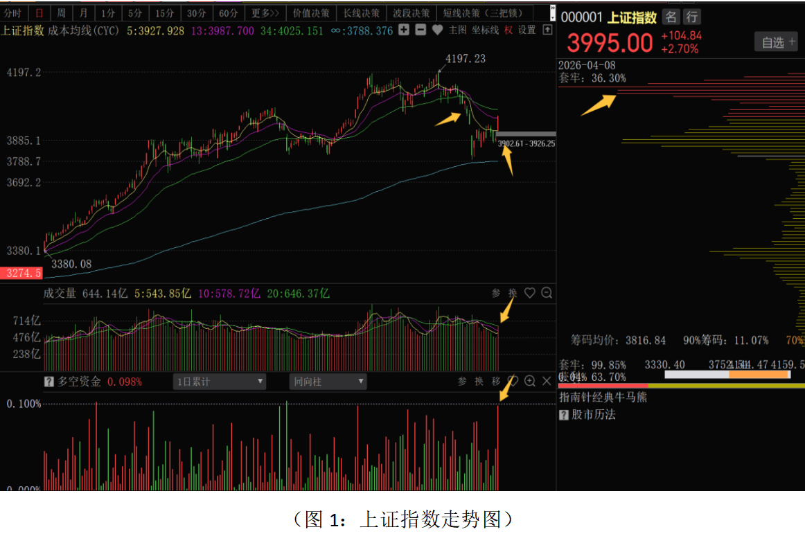 从上证指数来看,昨日股指跳空高开,强势大涨,逼近4000点整数大关,成交量明显放大,多空资金净流入688.72亿元,做空资金净流入量创阶段新高,主力资金做多积极性大幅提升。市场强势大涨的原因,一方面美国与伊朗达成为期两周的临时停火协议,这是中东局势紧张以来释放得最积极的信号,导致国际油价大幅下挫,有效缓解了市场对全球经济“滞胀”担忧,全球资金风险偏好迅速回升,这是市场强势大涨的外部因素。另一方面,节前市场大幅调整,技术上已经呈现明显的超跌状态,清明假期的影响,市场走势处于较为疲弱的状态,叠加国内较为积极的宏观政策的托底,市场有向上修复的空间。目前股指强势修复至4000点整数大关附近,昨日收盘基本上以最高点收盘,K线走势较为强劲。由于美伊停战两周,即将进入谈判环节,同时股指距离上方筹码密集峰,以及2月至3月平台位置仍有一段距离,近期股指仍有向上修复的时间和空间。同时,由于中东局势仍有不确定性,股指反弹至4050—4100点一带资金观望情绪会增加,可能会面临短线获利盘和解套盘的抛压,密切关注中东局势的谈判进程和关键位置的资金流向,关键位置不宜盲目追高。时间点上,年报和一季报业绩正在陆续披露,大部分个股强势反弹之后,部分个股技术上同步面临筹码密集峰和前期平台的压力,关键位置个股分化会加大。市场向上进一步拓展空间,需要中东局势稳定,业绩风险释放完毕,以及国内稳经济政策的进一步落地。目前整体运行逻辑,依然是内部政策环境托底稳健,外部环境仍有不确定性,震荡区间为3950—4050点。从0Z指数走势来看,股指强势大涨近4%,多空资金净流入1775.69亿元,70个板块中68个板块上涨,全市场超5000家股票上涨,整体处于普涨格局。技术上,股指强势反弹之后,即将临近前期平台和筹码密集峰位置,短期成交量不能持续放大,做空资金不能持续进场,注意强势上涨后冲高震荡的走势。从波段结构牛(大盘)指标组来看:熊股数量开始高位向下运行,马股数量拐头向上,牛股数量总体低位运行略有拐头的趋向,可以看出市场机会主要在超跌品种的修复上,尤其是前期由于中东局势影响受损的科技制造等板块。近期操作策略应继续采取稳健策略应对,总仓位控制在6成左右,底仓持股为主;短线仓位上涨不追高,低吸操作为主,部分品种应趁反弹根据关键位置资金流向和短线决策信号做好仓位调整。