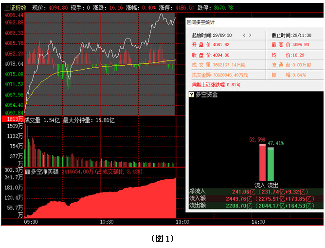 今日早间大盘虽然低开,但市场并未趁势下探,而是很快回升至4080点附近,并在11点后出现进一步上扬,至中午收盘时,指数位于4094点。从日K线图上看,今天上午大盘虽低开在5日成本均线下方,但在多方的及时反击下,指数快速夺回5日成本均线,并继续向上拉升,可见目前市场的短期强势格局依然没有发生改变,且下方承接力量很强,所以接下来行情很有可能会在资金的推动下再次向4100点整数关口上方发起挑战。从下方的多空资金来看,早间开盘后,多方就占据优势,随后资金持续流入。截止到中午收盘时,沪市当中多方力量高于空方超过5个百分点,资金流入240多亿。从六大战区的情况分别来看,截止到今日中午收盘时,六个战区均为资金流入状态,其中不仅沪中大盘战区资金流入高达163亿,创业板战区与深中大盘战区的资金流入额更是双双超过270亿。可见今日上午各战区均有资金积极进场加仓,多方力量远远强于空方,具备着压倒性优势。在这种情况下,行情就获得了向上的合力,所以午后大盘很有可能会站上4100点整数关口,为后市打开进一步上涨的空间。建议大家在控制好仓位的同时,积极关注近期有资金连续加仓的板块,并在其中优选个股,择机介入。