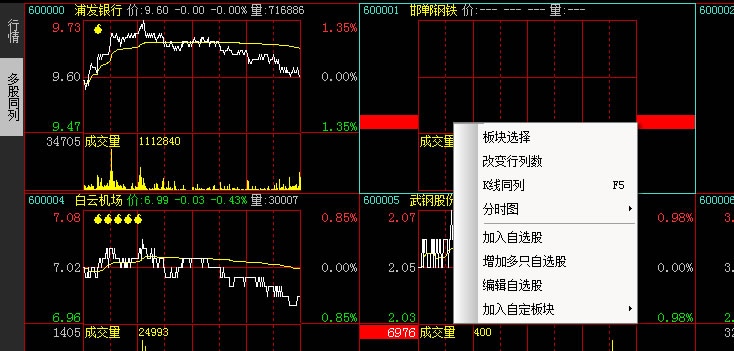 多股同列在右键菜单可以对其中的一只股票进行加入自选股和自定义板块的操作