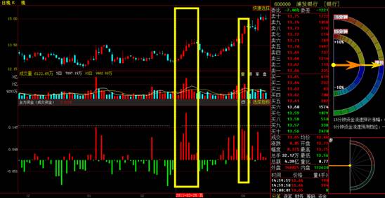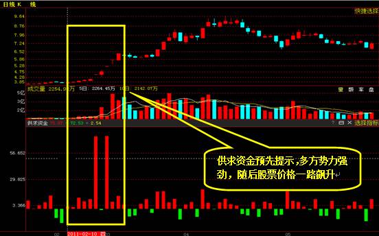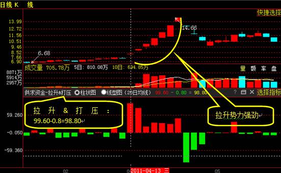 3, 供求资金-拉升&打压:此指标是供求资金最显着的一组供求力量对比。拉升代表多方势力;打压代表空方势力。拉升与打压比较的结果,影响股票的走势。数值为正,显示红色柱子,说明多方势力强,有上涨意愿;数值为负,显示绿色柱子,说明空方势力强,有下跌意愿。