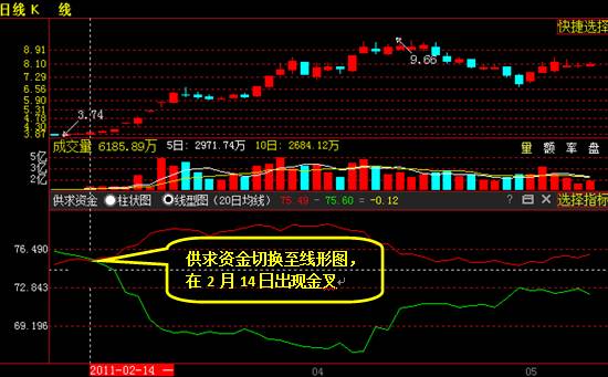 ① 供求资金柱形图,如下图所示(包钢股份600010,,2011年2月10日):
