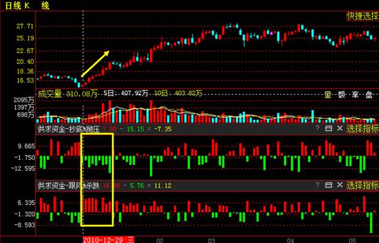 4, 供求资金-跟风&杀跌:此指标是供求资金的一组指标。跟风代表多方势力;杀跌代表空方势力。跟风与杀跌比较的结果,结合其他供求资金指标,共同影响股票的走势。数值为正,显示红色柱子;数值为负,显示绿色柱子。