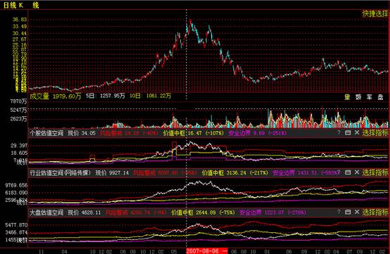 6, 估值空间:红色线代表风险警戒;黄色线代表价值中枢;紫红色线代表安全边界;白色线代表现价。根据现价与三个估值线的比较,来判断股票所属的估值空间位置。最高的估值线是风险警戒线,当股价突破该价位后,随时都有回调的风险;中间的线是价值中枢线,即股价的合理估值应该是围绕这条线附近波动;最低线是安全边界线,股价在这个时候进入低估区域,往往会触底反弹。