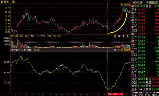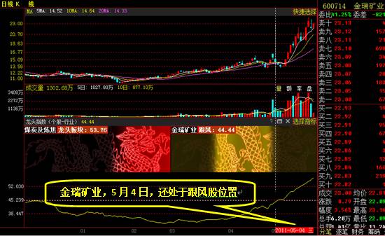 例如:金瑞矿业(600714)在2011年5月4日,处于龙头行业(煤炭及炼焦处于龙头行业)-跟风股的位置;