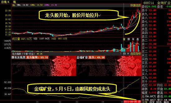 次日,金瑞矿业(600714)在2011年5月5日,处于龙头行业(煤炭及炼焦处于龙头行业)-龙头股的位置。随即,股票开始一路飙升。