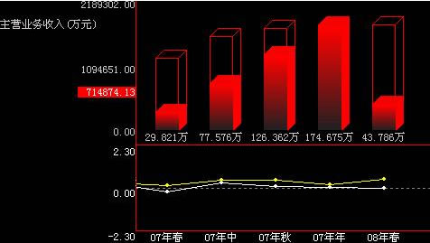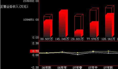 我们可以看到,07年春的柱状图,是空心和实心相间的状态。从数字上可以知道07年春的主营业务利润收入是29.821亿元,那么这根柱子的实心部分就特指07年春的实际的主营业务收入29.821亿元,而空心部分是指在07年春的基础上对07年未来三个季度的预测,即07年一年的主营业务收入预测=07年春主营业务数值×4。整根柱子的高度就是07年春的高度×4。不同报告期的数值简单计算一下,就可以知道相应的柱状图的高度。年报的柱状图是实心的,年报没有预测值,是实际数值的展现。