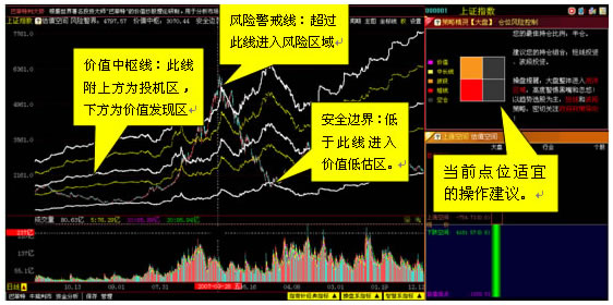 中间的白线为价值中枢线,此线上方为投机区,投资者操作时需注意风险;此线下方为价值发现区,适合操作价值低估的股票。