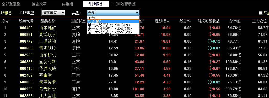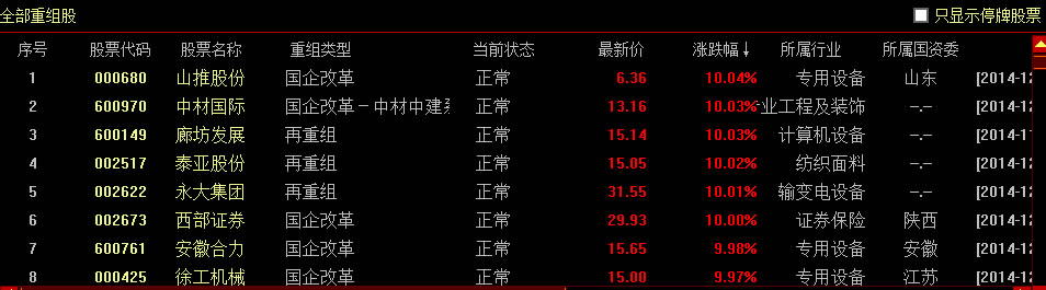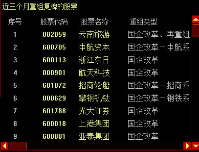 在重组股票池选中不同的重组类型,这个窗口会相应的显示该类型的复牌股票