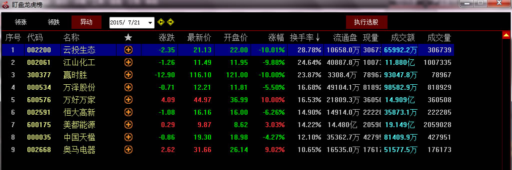 出现突然的异动单的股票集合。如下图股票由跌停出现大幅拉升。