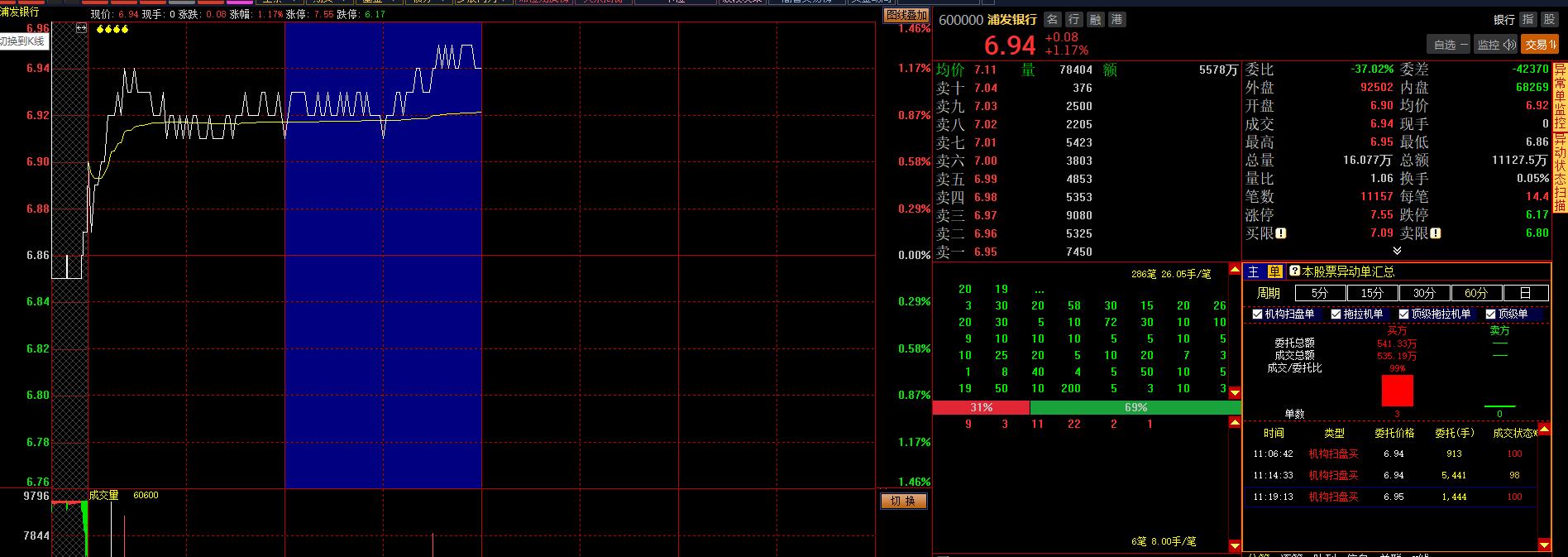 分时图中的L2全景与K线界面下的L2全景功能一致,在此不再赘述。需要注意的是,主力买卖分析和当日特单信息都包括时间周期的选择,当选择某个周期(如60分钟)时,左侧分时图界面上与之对应的部分会用蓝色背景突出显示。