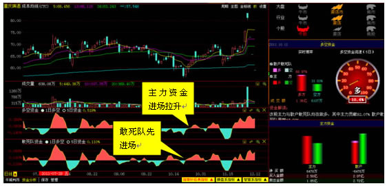 敢死队资金:不同于市场上的主力资金,它是指南针最新研发的的索罗斯模型监测到的一类变频资金,它潜伏于散户中,在市场机会临近时,主动出击引导走势。 有敢死队资金进场时,应该充分关注资金动向,如果主力资金和多空资金都在流入,且流入的速度可观,趋势形成,则拉升的时机将至。 个股牛熊指标的显示需要申请,申请之后如下图所示: 博弈版可以申请此指标的试用。