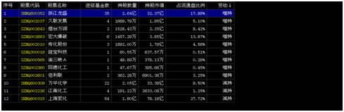 点击“全部基金持股”,并将点击行业部分的“变动”按钮,系统自动将“增持”的板块排在前面。接着点击第一个板块。