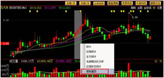 用户可以根据需要,选定自己需要的一段K线或者几根K线,选定完成鼠标左键,会浮出可选项,选择提取基因,进行分析,如下图所示: