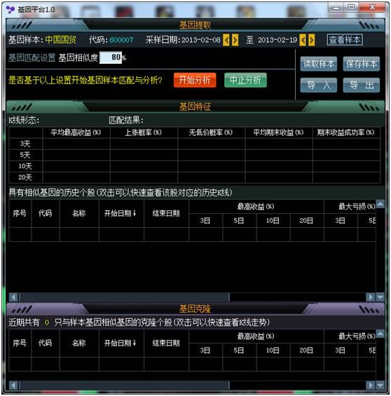 基因平台1.0以历史重演论为理论依据,根据K线组合和形态分析,对所选样本进行剖析。用户可以根据自己需要,对相似度进行设置。相似度越高,相似样本数量越少;相似度越低,相似样本数量越多。