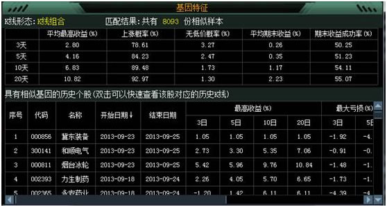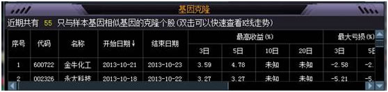 通过对样本的基因特征分析,帮助了解历史上与相似基因样本的平均最高收益、上涨概率、无低价概率等情况,从而对所选样本进行操作分析。通过对所选样本的基因克隆,可以找出近期与样本基因相似的克隆个股。