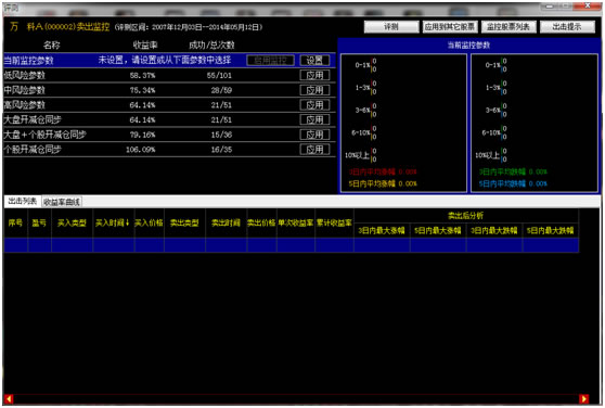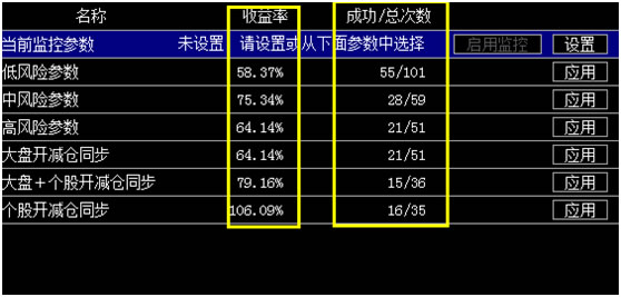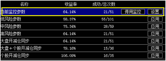 系统给出6种参数策略适用于不同市场,分别为:低风险参数、中风险参数、高风险参数、大盘开减仓同步、大盘+个股开减仓同步、个股开减仓同步。用户也可以根据个人需求和个人风险偏好选择设置不同的风险参数策略进行股票监控。系统同时给出各种策略在评测区间内的成功/应用次数和收益率的情况,便于用户参考。