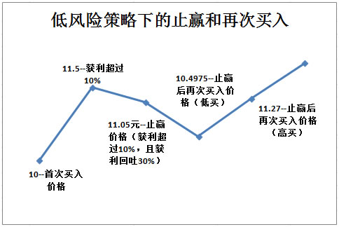 低风险操作策略的再次买入策略的设定:止盈后再次买入策略的低买条件为股价下跌后再次上涨,且涨到止盈价的95%时再次买入;高买的条件为低买不生效,且股价超过止盈价的102%时再次买入。比如在这个例子里再次买入(低买)的价格为10.4975元(11.05*95%=10.4975)再次买入(高买)的价格为11.271元(11.05*102%=11.271)。止损后再次买入策略设定低买条件为股价下跌后再次上涨,且涨到止损价的95%时再次买入;止损高买的条件为高买不生效,且股价超过止损价的102%时再次买入。比如在这个例子里9.2元是止损价,再次买入(低买)的价格为8.74元(9.2*95%=8.74)再次买入(高买)的价格为9.384元(9.2*102%=9.384元)如下图所示: