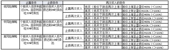 低风险操作策略的止盈策略的设定为:个股买入后获利超过10%,且获利回吐30%时卖出。比如买入价为10元,股价上涨至11.5元(获利超过10%),当股价降至11.05元(11.5-(11.5-10)*30%=11.05)时卖出止盈。止损策略的设定为个股自买入后亏损达到8%时卖出,即10-10*8%=9.2元。