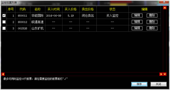 卖出监控最多可同时监控10只股票,在需要监控的票前打勾即开启监控。在此界面中还可以对监控策略进行参数编辑和策略删除操作。