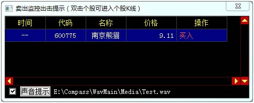 点击出击提示,弹出卖出监控出击提示界面。其中双击提示中的股票,可以进入到个股的k线界面。