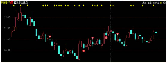 即可在k线界面上叠加盘中监控的股票买卖的出击点,如下图所示,其中圆形