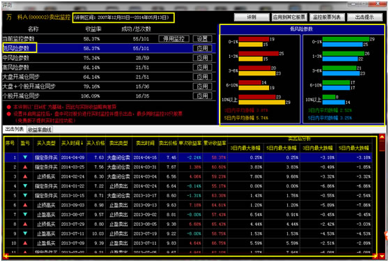选中参数策略可以预览查看此参数在该股票的历史监控出击中的操作绩效。如股票000002万科A的低风险参数策略在2007年12月03日-2014年05月13日的评测区间的绩效和出击列表、收益率曲线。