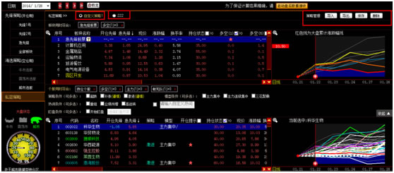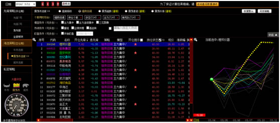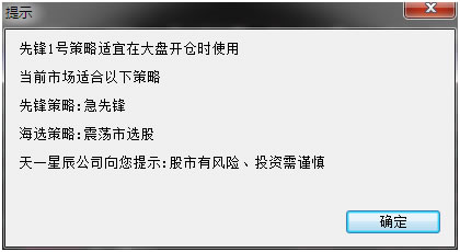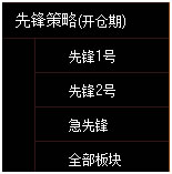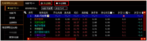 5.1当大盘处于开仓期时,推荐“先锋1号”策略和“先锋2号”策略,显示为可选状态。若为非开仓期,推荐选择“急先锋”策略。先锋1号和先锋2号策略以大盘开仓后筛选出开仓的板块,再从开仓板块中筛选出开仓的股票。