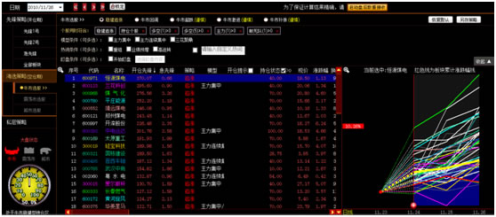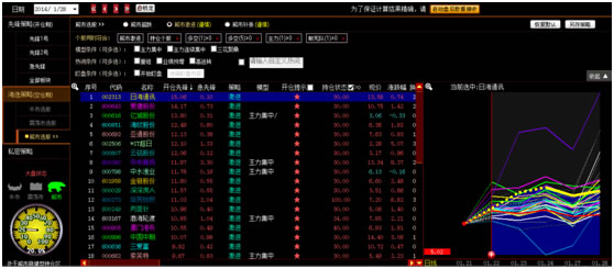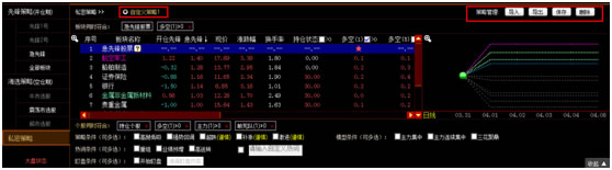 右侧为当前筛选出的股票在大盘开仓前后的价格涨跌幅走势对比及持仓情况。