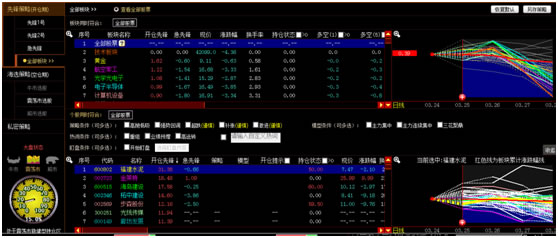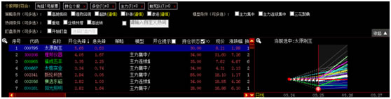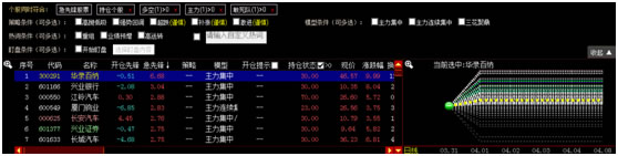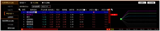 股票列表右侧为大盘开仓前后股票的价格涨跌幅走势,大盘开仓后,可以查看到各股票开仓前后的持仓情况和涨幅趋势。