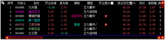 开仓策略下的个股为开仓当日通过筛选出的开仓板块中筛选出的股票,补仓策略下个股为开仓当天没有跟上操作的补仓选股。