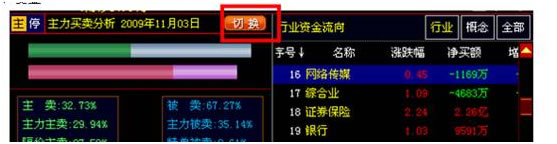 在资金页签中的 “切换”按钮用于切换饼状主力买卖图历史信息和柱状机构私募散户买卖分析图。