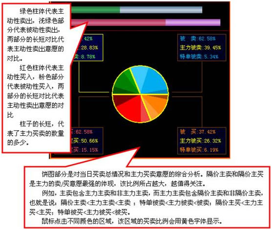 柱状图反应的是机构私募和散户的买卖能力对比,将饼图中的主力分解为机构与私募,从全局的角度观察多空力量对比。该图分为上下两部分:上半部分显示当日的实时情况;下半部分显示鼠标所在位置的历史数据,当圈中多条K线时,显示该时段内的变化情况。红色柱状代表当日买入额,绿色柱状代表当日卖出额,空心部分代表在该时段内买入/卖出额的减少,粉红色部分代表在该时段内买入/卖出额的增加。柱子的高矮代表买入力量和卖出力量的对比。