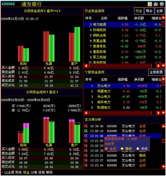 - 分类资金流向(盘中T+0):显示的是当日的机构、私募、散户的买入卖出额及成交占比情况。