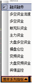 2)指标窗口中点击“博弈系列指标”菜单中的“融资融券”选项,打开该股票的“融资融券”指标组。