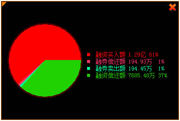 选择“融资余额”选项,将光标放在线上任何想要查看的时间点上,点击红色空心圆,弹出饼状图数据为光标所选日期的融资余额状况。如下: