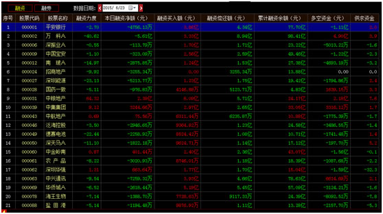 默认界面显示的为“融资”的排序状况。列项内容为:“序号”、“股票代码”、“股票名称”、“融资力度”、 “本日融资净额(元)”、“融资买入额(元)”、“融资偿还额(元)”、 “累计融资余额(元)”、“多空资金(元)”、“供求资金(元)”(供求资金在部分版本不提供)。列项支持可单项排序,多选排序等功能。双击股票,进入k线界面。