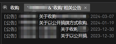 该区域显示的是左侧股票池中选中个股的公告资讯,提供勾选项:公告、资讯。可选择勾选查看其中之一或者两者混合显示。对于含有已勾选关键字:收购、定增、重组、股权转让 的公告/资讯,该公告/资讯标题将进行标红处理。